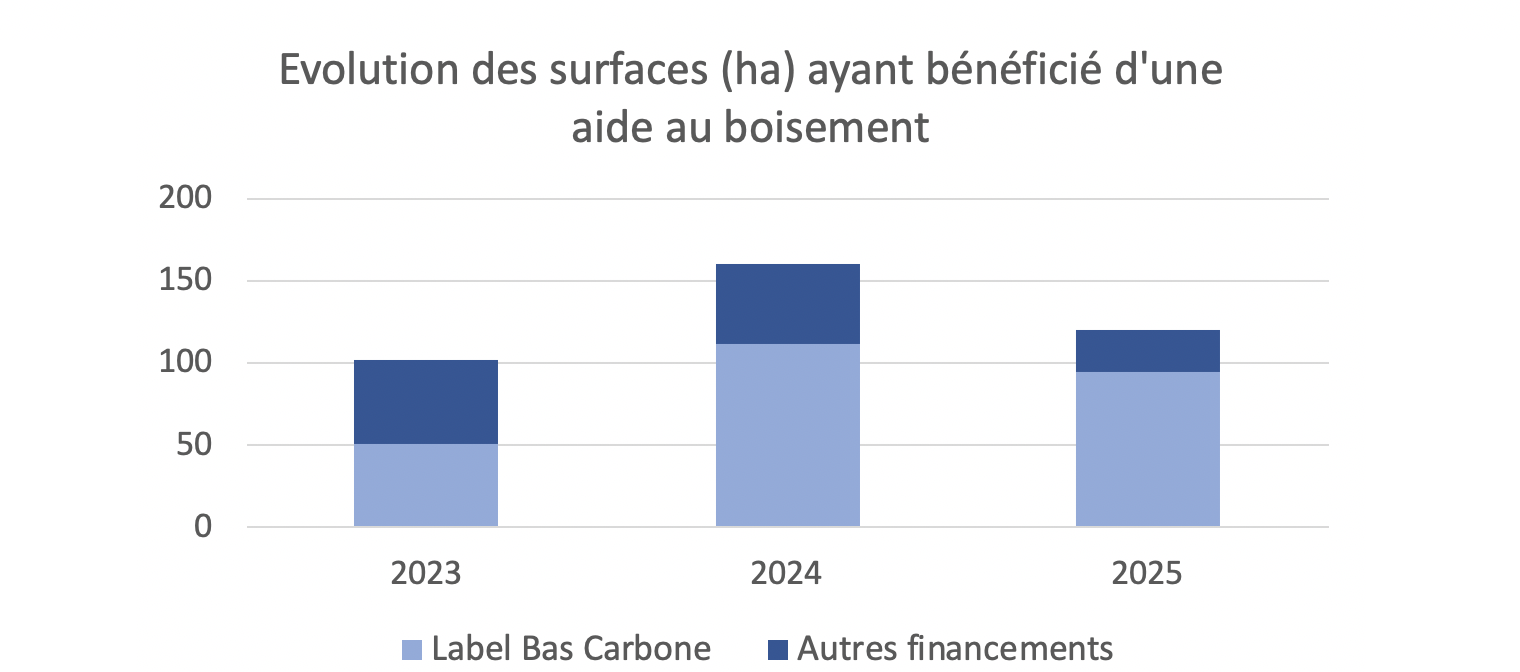En 2025, 120 ha ont bénéficié d’une aide au boisement pour un montant total de 725 000 €. Cette surface est en baisse par rapport à 2024 mais la part de surface labellisée bas carbone a augmenté passant de 70 % en 2024 à 78 % en 2025.