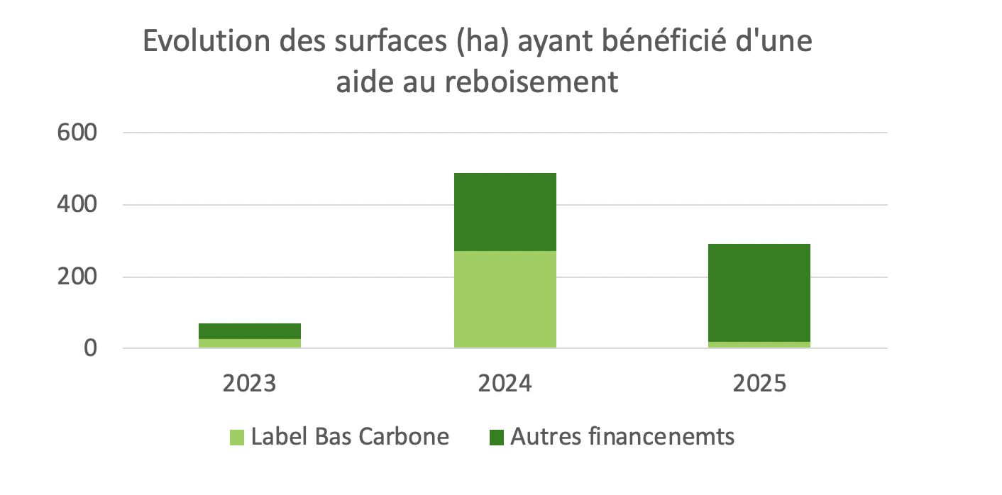 La part de surface de reboisement labellisés bas carbone dégringole par rapport à 2024 et passe de 56 % à 6 %. A voir si cette tendance se poursuit en 2026.